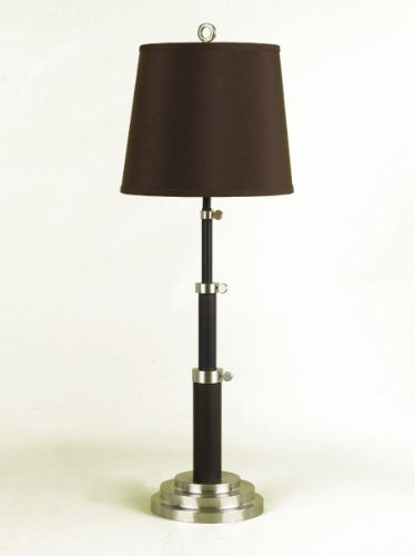 The Candice Olson Scope Table Lamp is adjustable, perfect for the living room or study, accommodating readers of different heights Simply twist the satin nickel finished knobs, which also add a stylish element to the reading lamp, to reach up to 30" high. This beautiful lamp has a chrome base with three grooved oil-rubbed bronze poles and a poly silk chocolate brown shade. 100-Watt Edison Base. Assembly level/degree of difficulty: Easy.