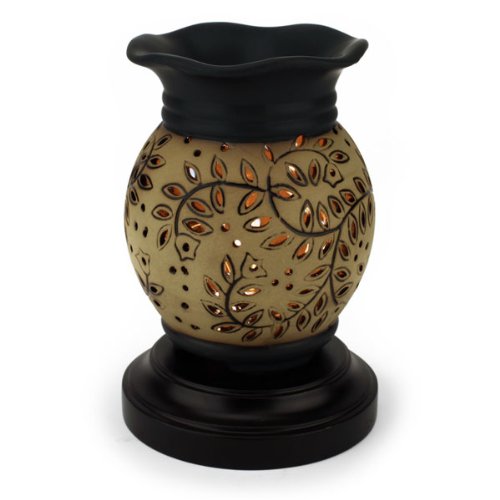- Ceramic electric oil warmer measures 8" tall diameter. One piece unit, with attached bronze oil dish. The body is accented with a vine pattern with holes shaped as the leaves to let the light through when the warmer is on.
