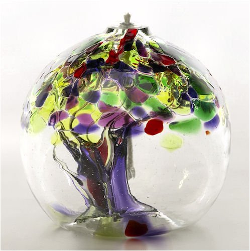 Displaying all the variety of colors to express a human spirit's attributes, the vivid "LIFE" Tree Of Enchantment Oil lamp is an eye-catching decoration. The interior blown glass threads invoke the image of a tree trunk, supporting the lamp's spherical form.Kitras Art Glass uses centuries old glass blowing techniques to create these one of a kind pieces of blown glass art.Light this lamp and relax as the vibrant colors dance across this burning orb. Like trees in a forest, no two are the same, and each is a symbol of growth, strength, and the cycle of life. As the seasons change, so does nature's palette.This Tree of Enchantment Oil Lamp is also available in both Seasonal and Sentiments patterns. See our other listings for the other colors as well, to choose your favorite.These orbs are made up of a beautiful mix of colors, and each one is unique and unlike any other in its combination of colors and patterns. The photos are just an illustration of one combination.
